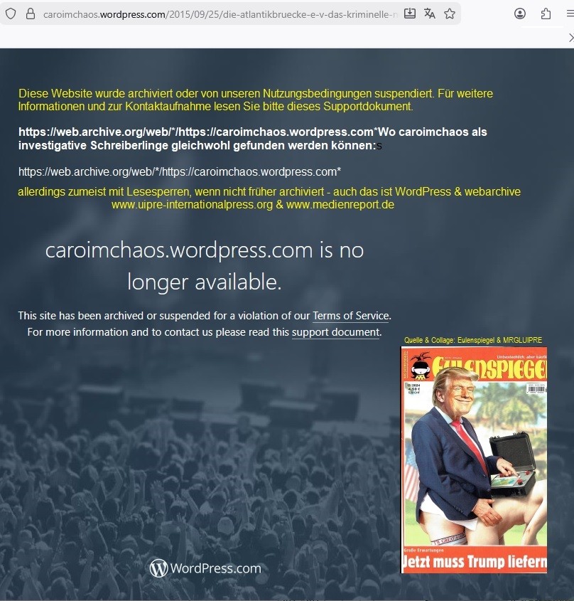 Als Rainer Neske 2013 vergaß, die Deutsche Postbank und kriminelle Eingriffe zu kontrollieren. Anstifter, Helfer, Kriminelle, LBBW. BAFIN an UIPRE am 02.01.2017: „Ich hatte Ihnen bereits mitgeteilt, dass sich das Institut (Anm.: die Deutsche Postbank vertreten durch Strauß und Neske) schadensersatzpflichtig machen könnte, wenn es an einen Nichtberechtigten auszahlt.“ Genau dies hat das Amtsgericht Müllheim 2013 rechtlich zutreffend festgestellt. Seitdem kann man von allen Neskes lernen, was das Oberhaupt der kriminellen Baseler Vereinigung iepa allen Kunden und Nachrichtendiensten in http://web.archive.org/web/20151015132310/http://www.fa-shoot.de/ lehrte: Liquidieren von Politiker und Journalisten, die dem Schießverein nicht folgen. Hier die Geschichte: Als Medienreport in einer Pressemeldung die Amtsbeendigung des Stuttgarter OBs Fritz Kuhn vor dem Hintergrund des Stuttgarter Politik-, Rechts- und Bankenklüngels begrüßte, fehlte die politische Aufdeckungsbereitschaft, auch gleich die Regierungs- und Bankverantwortlichen zu entlassen, die seit Jahren als Lobbyisten vorgewärmte Stühle in Berlins guten Politikstuben beanspruchen. Deutsche Banker – geprägt von Schweizer kapitalistischen Tricksern und hier und da von deliktischen Gesellschaftsgefährdern umgeben, sind Medienreport und zehntausenden KMU-Kunden aufgefallen, auf deren Kosten sich die Bankenwelt bereicherte und „krankschrumpfte“. War noch das Aufsichtsratssalär von OB Fritz Kuhn persönlich verführerisch, gab es auch mal rotgrüne Anstandszeiten, nachzulesen unter https://dserver.bundestag.de/btd/17/123/1712332.pdf. Ein Kreis, darunter der nicht mehr wiederberufene Stuttgarter RA Richard Pitterle von den Linken, erhielt die keineswegs ganz ergiebige Auskunft zu „Beziehungen von Geschäftsbanken und Investmentbanken zur Bundesregierung“. Der Einfluss von Rainer Neske und den Strategien seiner DB- und L-Bank-Klicke, die nicht nur von dortigen Abteilungsleitern Markus Füeß und Doris Kaschel später anweisungsgemäß penetriert wurden, war zu dem Zeitpunkt zwar nur marginal sichtbar, aber den Nachfragern fehlten offenbar auch Netzwerkhintergründe und die Fähigkeit, zieldefinierte Bösartigkeiten und Relativierungen nachzuempfinden. Pitterles Kanzlei, nicht immer von seinen Mandanten als Glücksgriff erlebt, musste sich vielfach dümmster und widerlichster Angriffe erwehren. Hier abrufen - Langfassung: Rainer Neske LBBW Dt Bank Postbank BAFIN iepa - nix Pressefreiheit 7-2021.pdfHier abrufen: Die Neske-LBBW - Der Aufsichtsrat OB Kuhn und die KMU-Geschaedigten 13-01-2020.pdf Hier abrufen: Rainer Neske LBBW Dt Bank Postbank - BAFIN-Doku Krimineller 07-2021.pdf Die Redaktionen von UIPRE- und Medienreport warnen vor Bitcoin-Fakes und Geldwäsche Wer durch eine „falsche Recherche“ bei Google oder ähnlich „gemarkert“ wurde und weiter recherchiert, stößt in späteren Informationsangeboten u.a. auf vorgebliche Berichte erster Mediennamen und erster Adressen sowie Empfehlungen und Angebote, die es niemals gegeben hat. Die Bitcoin-Promotoren „PatternTrader“ schreiben abschließend (Originalzitat): „Alle auf Dieser Webseite dargestellten Personen, Informationen und Ereignisse sind vollständig fiktiv. Jegliche Ähnlichkeit zu tatsächlichen Ereignissen oder lebenden oder toten Personen ist rein zufällig.“ Würden hiesige Journalisten den umfangreichen Fälschungen folgen und solche Sätze überlesen, würden sie „unverschuldet“ Fake News verbreiten. Auffällig l: Deutsche Staatsanwaltschaften, deutsches Recht und deutsche Medien priorisieren mit einseitigen gesellschaftspolitischen und unwissenschaftlichen „Missbrauchsthematisierungen“ Wahrnehmungen, in denen die volkswirtschaftlichen und deliktischen Missbrauchs-Einwirkungen durch die Banken- und Finanzwirtschaft kaum vorkommen.Auffällig ll: Presse, Medien und Recht ignorieren die sichtbaren öffentlichen Täuschungen noch zu oft – offenbar im Blick auf ihre Geschäftsmodelle, Anzeigenkunden und Rechtserwartungen. Ermittlungen und Erörterungen bleiben dazu weitgehend unbekannt. Die Betreiber der international agierenden Erpresser und der Bitcoin-Netzauftritte, deren Verantwortliche nicht einfach feststellbar sind, dringen in Computer ein und verwenden Bilder, Namen, Daten, Bild- und Urheberrechte und Zitate ohne Autorisierung; die Auftritte verstoßen mindestens gegen das deutsche TMG-, Wettbewerbs-, Urheber- und Strafrecht. Auffällig geworden sind diese und ähnlich agierende Betreiber durch ihre Eingriffe in Server mit der Folge ganzer Datenzugangssperrungen oder ihre Kooperationen mit kriminellen Anbietern von normal zugänglichen pornografischen Medien. Sie verlangen für ihre Freischaltung oder ihr Stillschweigen Euros und Dollars in Bitcoin umgetauscht. Andere Handlungsempfehlungen können jedoch bei geprüften Medienberatern hinterfragt werden (www.fdm-ev.de). Fragen Sie Ihre Zeitung, TV-Sender, Betroffene und Staatsanwälte nach den Gründen, warum Sie die Klappe halten, sich nicht wehren und warum sie Bitcoin-Zahlungsmittel damit letztlich promoten. Bitcoin ist häufig die Währung für Kriminelle und auch Zahlungsmittel zur Auflösung von Serverblockaden und Porno-Schweigegeldern sowie für Geldwäsche ff. Rufen Sie hier einfach ein paar Zusammenstellungen ab. Der UIPRE-Report und Medienreport distanzieren sich von allen dargestellten Rechercheinhalten der abrufbaren virenfreien PDFs. Dies gilt auch für die redaktionell ungeprüfte „Empfehlung etoro“ von https://finanzsache.com/kryptowaehrungen/bitcoin/betrug/. Diese Netzseite enthält eine der umfassendsten Betrügerzusammenstellungen. Weitere Informationen sind ggfs. bei seriösen Medien und LKAs abzurufen. Hier abrufen: UIPRE-Warnung vor Bitcoin-Fakes und Geldwäsche 04-05-2021.pdf Hier abrufen: Bild - Höhle der Löwen-Bitcoin-System Fake & Verarschung 04-06-21.pdf Hier abrufen: Bitcoin-Warnung The Pattern Trader 04-06-21.pdf Hier abrufen: Netzakquise Bitcoin Pr