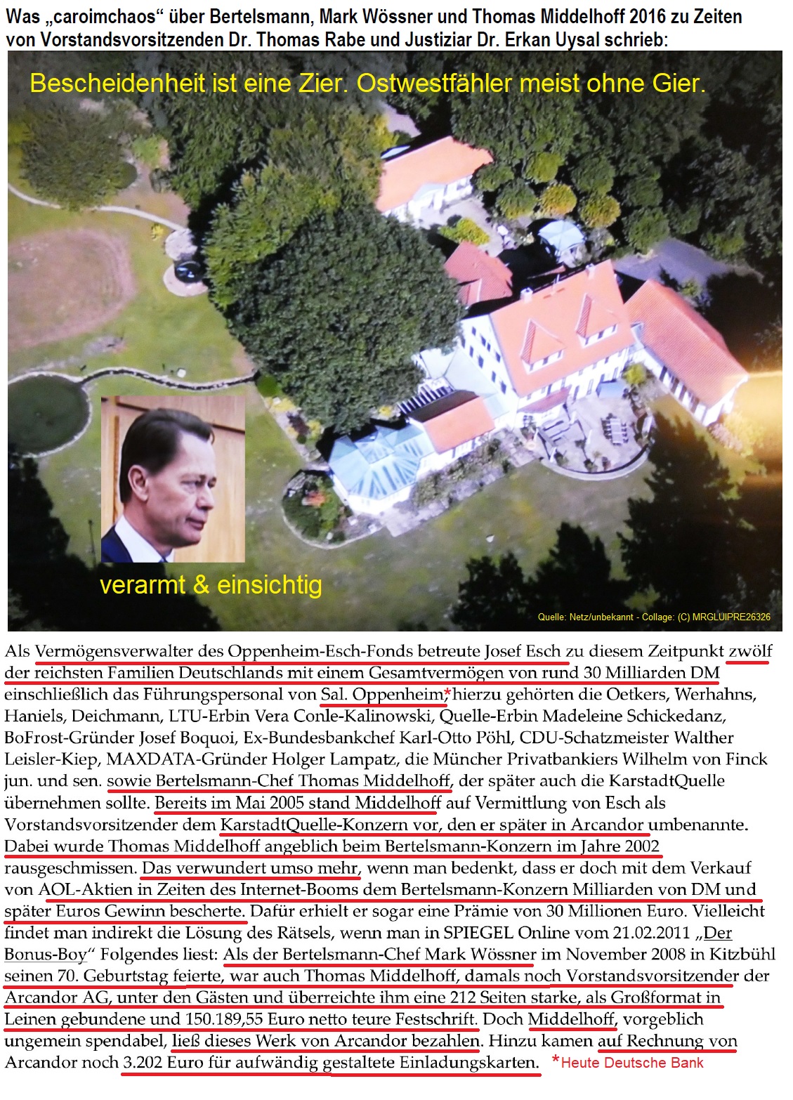 Medienreport, 1974 von Rolf G. Lehmann erstmals herausgegeben, hat sich im weiteren Sinne als Mittler zwischen Anwendern audiovisueller und neuer Medien in Wirtschaft und Verwaltung sowie Unternehmen und Institutionen dieser Medienbranche entwickelt. Neben der publizistischen Tätigkeit zählen u.a. die Organisation und Durchführung von Fachveranstaltungen in Medien- und Kommunikationsfragen für die Wirtschaft und AV-Branche sowie Verbandsgeschäftsführungen und Studien zu den Dienstleistungen. Ihr Gesprächspartner ![]() Rolf G. Lehmann, Journalist, Coach, Gutachter und Medienberater. 1974-2024 Geschäftsführer der Medienreport Verlags-GmbH – Medienberatung. Sprecher der FAC Fördergemeinschaft Audiovisual Communication 1989.2024 und der EMC European Masterclass Community: Geschäftsführer der Medienakademie der Medienberater, MDM. Geschäftsführender Vorstand von UIPRE Union Internationale de la Press et Eelectronique von 2011-2024. (Auszug). Mitgliedschaften: Union Internationale de la Presse Electronique UIPRE, Deutsche Gesellschaft für Photographie DGPh 1978-2019. PTW Presseclub Tagung und Weiterbildung, Deutsche Journalisten Union DJU/ver.di (Landesvorstand B-W ver.di Selbständige ab 2022). HBV/IG-Druck/ver.di 1971-2024. VK e.V. /IDK 1967-1976. Ein Märchen von „Caro im Chaos“: Der Kölner Klüngel und die Bankenwelt um Oppenheimer, Graf von Krockow, Bertelsmann, Middelhoff und vielen anderen 2016. Aufgefrischt und wieder lesbar gemachter Originaltext. Vorwort: Der nachfolgende Beitrag enthält Namen, Angaben und Einschätzungen, die von größtem öffentlichen Interesse zur Meinungsbildung sind, nachdem diesseitige Recherchen von Anwürfen durch einen Wilfried Meißner aus Saalfeld gegen Liz Mohn, Christoph Mohn, die Bertelsmann Stiftung und CDU-Landrat Sven Adenauer nicht beantwortet wurden. Das o.a. Unternehmen betreibt mit RTL den privaten Nachrichtensender NTV und greift mit der Bertelsmann-Stiftung in gesellschaftliche Prozesse ein. Durch öffentlich-politische Befragungen zum Gesellschaftsgeschehen hat RTL NTV eine Form eines kommerziellen Geschäftsmodells zur Meinungsbildung und Eigenfinanzierung geschaffen, das den Wettbewerb der öffentlichen TV-Medien benachteiligt.