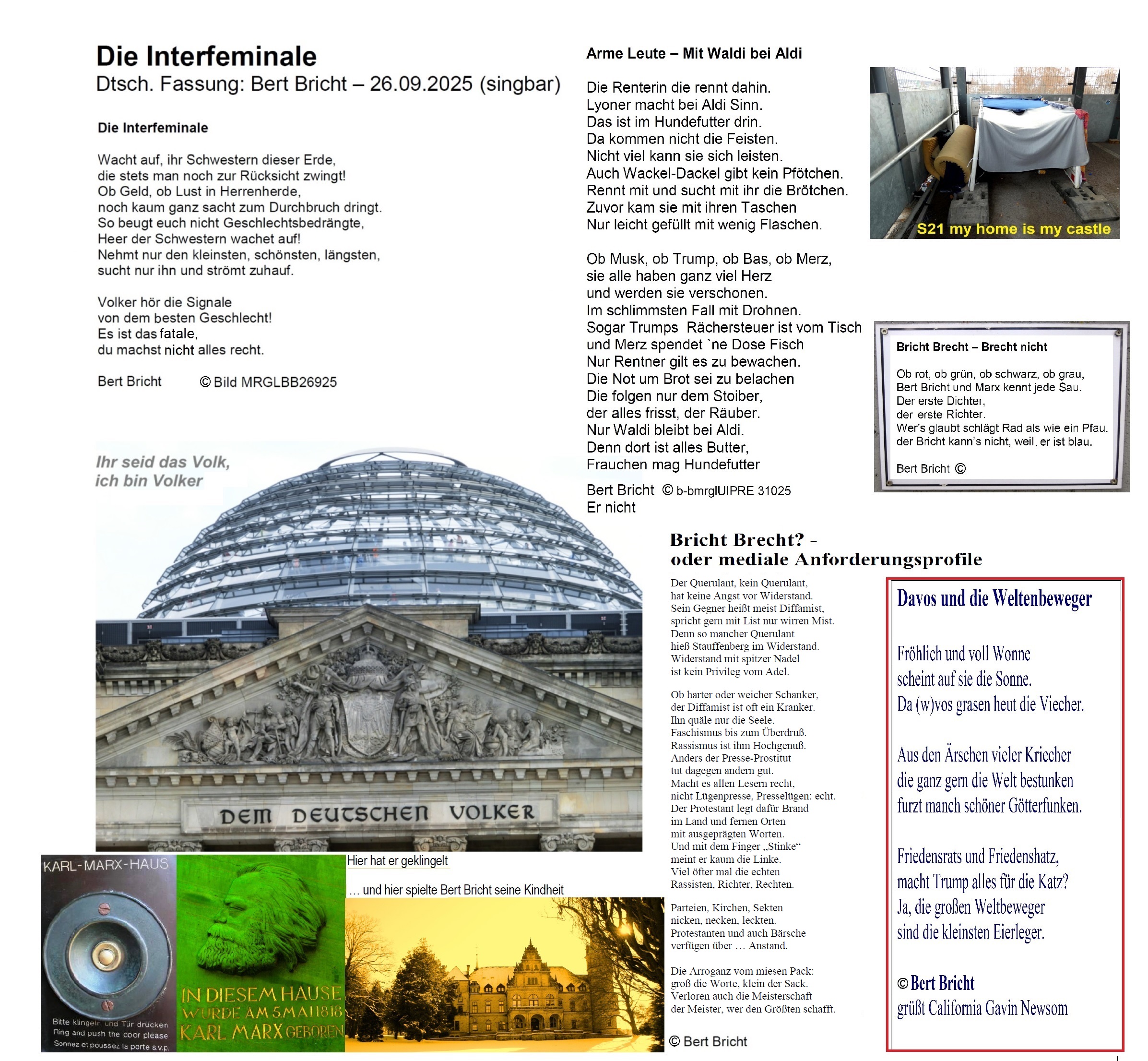 Als Bert(h)olt Brecht am 10 Februar 1898 geboren wurde, war Oma Luise schon sieben Jahre alt. Oma Luise blieb bis an ihr Lebensende gehör- und sprachlos als ihr Enkel erkannte, dass seine richtigen Eltern gar keine Kinder hatten. Bert Bricht, der sich von Berti adoptieren lassen wollte, verschwandt in den hybriden Potenzialen der Lebensereignisse. Aber Berti verstarb leider im gleichen Jahr 1956. So beschloss Bert in den 60ern die Fortsetzung der Arbeit mit seiner Handschrift und fand bei einem Medienreport-Freund eine stille Heimat für laute Laute im Geist von B.B. und Berta. Nach hartem Ringen, lässt Bert riechen, was Bertholt heute zu Davos 2026 sagen würde.