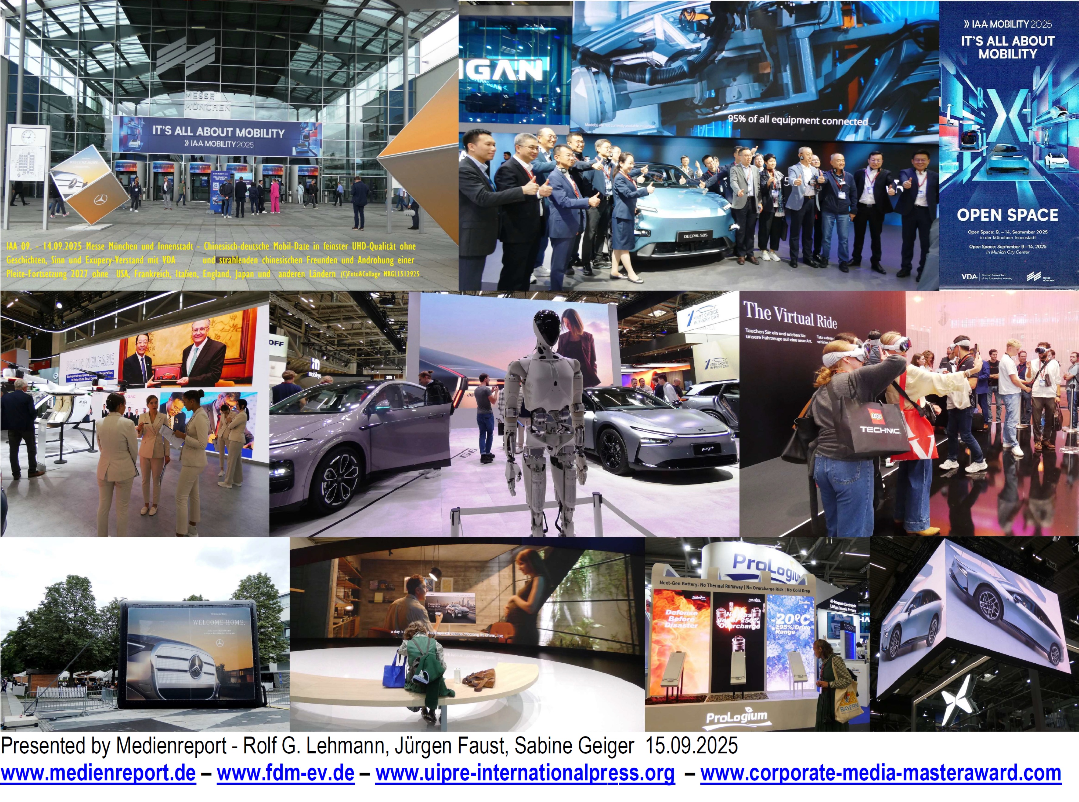 Medienreport, 1974 von Rolf G. Lehmann erstmals herausgegeben, hat sich im weiteren Sinne als Mittler zwischen Anwendern audiovisueller und neuer Medien in Wirtschaft und Verwaltung sowie Unternehmen und Institutionen dieser Medienbranche entwickelt. Neben der publizistischen Tätigkeit zählen u.a. die Organisation und Durchführung von Fachveranstaltungen in Medien- und Kommunikationsfragen für die Wirtschaft und AV-Branche sowie Verbandsgeschäftsführungen und Studien zu den Dienstleistungen. Ihr Gesprächspartner ![]() Rolf G. Lehmann, Journalist, Coach, Gutachter und Medienberater. 1974-2024 Geschäftsführer der Medienreport Verlags-GmbH – Medienberatung. Sprecher der FAC Fördergemeinschaft Audiovisual Communication 1989.2024 und der EMC European Masterclass Community: Geschäftsführer der Medienakademie der Medienberater, MDM. Geschäftsführender Vorstand von UIPRE Union Internationale de la Press et Eelectronique von 2011-2024. (Auszug). Mitgliedschaften: Union Internationale de la Presse Electronique UIPRE, Deutsche Gesellschaft für Photographie DGPh 1978-2019. PTW Presseclub Tagung und Weiterbildung, Deutsche Journalisten Union DJU/ver.di (Landesvorstand B-W ver.di Selbständige ab 2022). HBV/IG-Druck/ver.di 1971-2024. VK e.V. /IDK 1967-1976. IAA München 2025 - The Mobility-Fake - All or nothing? - Get the best IAA pictures now