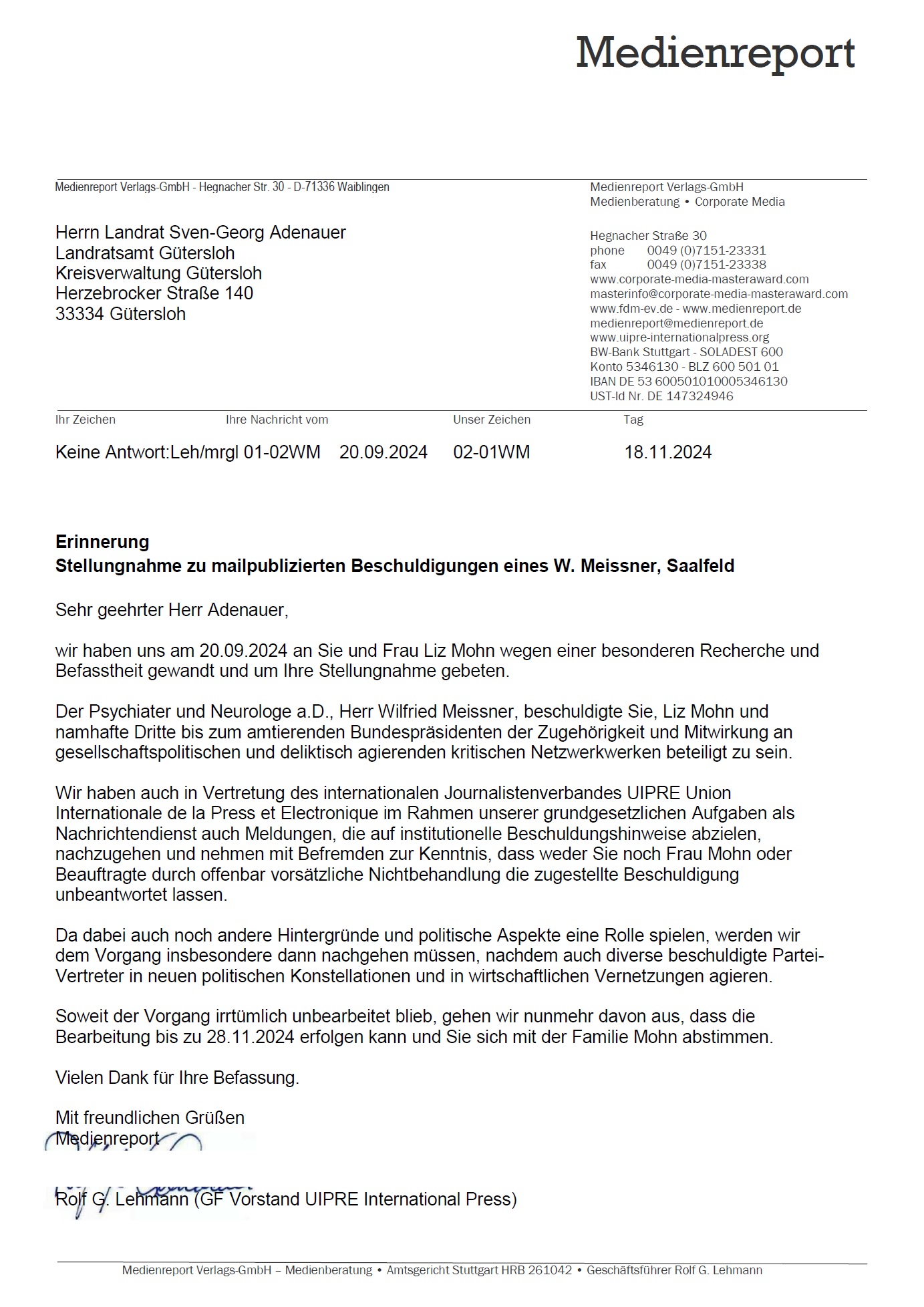 Über Bertelsmann Auszug Erinnerung - Stellungnahme zu mailpublizierten Beschuldigungen eines W. Meissner Sehr geehrter Herr Adenauer, wir haben uns am 20.09.2024 an Sie und Frau Liz Mohn wegen einer besonderen Recherche und Befasstheit gewandt und um Ihre Stellungnahme gebeten. Der Psychiater und Neurologe a.D., Herr Wilfried Meissner, beschuldigte Sie, Liz Mohn und namhafte Dritte bis zum amtierenden Bundespräsidenten der Zugehörigkeit und Mitwirkung an gesellschaftspolitischen und deliktisch agierenden kritischen Netzwerkwerken beteiligt zu sein. … Soweit der Vorgang irrtümlich unbearbeitet blieb, gehen wir nunmehr davon aus, dass die Bearbeitung bis zu 28.11.2024 erfolgen kann und Sie sich mit der Familie Mohn abstimmen. … Vielen Dank für Ihre Befassung. Mit freundlichen Grüßen – Medienreport. IHK: Dank und Anerkennung für Medienreport-Leistungen zum Wohle der heimischen Wirtschaft Der IHK-Präsident Claus Paal und der leitende Geschäftsführer Markus Beier aus Stuttgart und Waiblingen haben dem Geschäftsführer der Medienreport Verlags-GmbH, Rolf G. Lehmann, und der seit 1981 verbundenen Medienreport-Korrektorin, Sabine Geiger, am 10. Dezember 2024 eine Ehrenurkunde und Anerkennung für 50 Jahre „Leistungen zum Wohle der heimischen Wirtschaft seit Gründung des Unternehmens 1974“ überreicht. Entsprechend grüßte Medienreport zum Weihnachtsfest 2024.